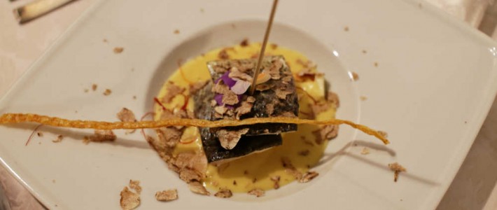 Unione tra Due Mondi Crema di ceci al carbone vegetale, cialda croccante di pasta all’uovo con tagliata di baccalà, nuvola di Tartufo Bianco e tocco al germoglio dolce. Continua...
